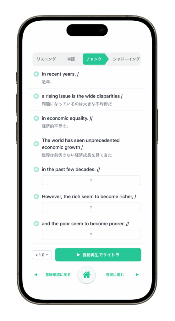 上記のように英語のかたまりごとに表示される仕様なので、チャンクリーディングでリスニング力・リーディング力を着実に伸ばしていけます。